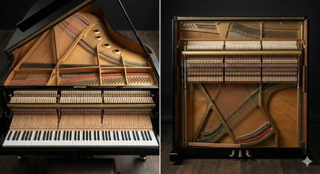 Historicamente, o piano de cauda foi o primeiro formato criado por Bartolomeo Cristofori no século XVIII. O piano vertical surgiu posteriormente como uma adaptação inteligente para otimizar espaço e custo, mantendo o princípio sonoro básico: martelos que percutem nas cordas.