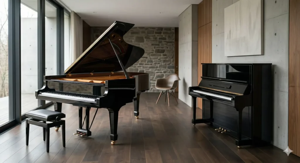 - Espaço e Estética: O piano vertical é funcional e compacto. O piano de cauda é uma peça central de performance e design.