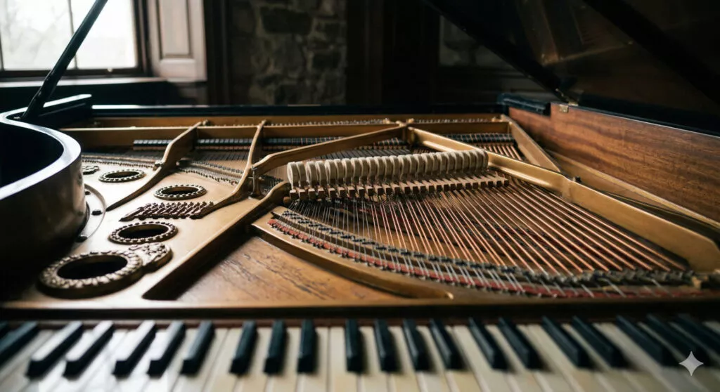 Um piano acústico é um instrumento onde o som nasce de um processo puramente mecânico e físico. Ao pressionar uma tecla, um martelo atinge as cordas, e essa vibração é amplificada pela tábua harmônica — a “alma” do instrumento.